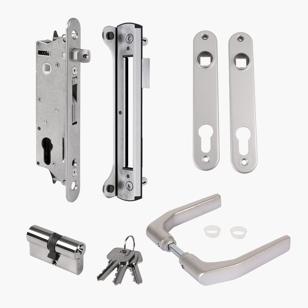 VSEBUJE: Locinox sixtylock, cilindrični vložek 30/30, SREBRNA kljuka in ščiti, prejemnik ključavnice